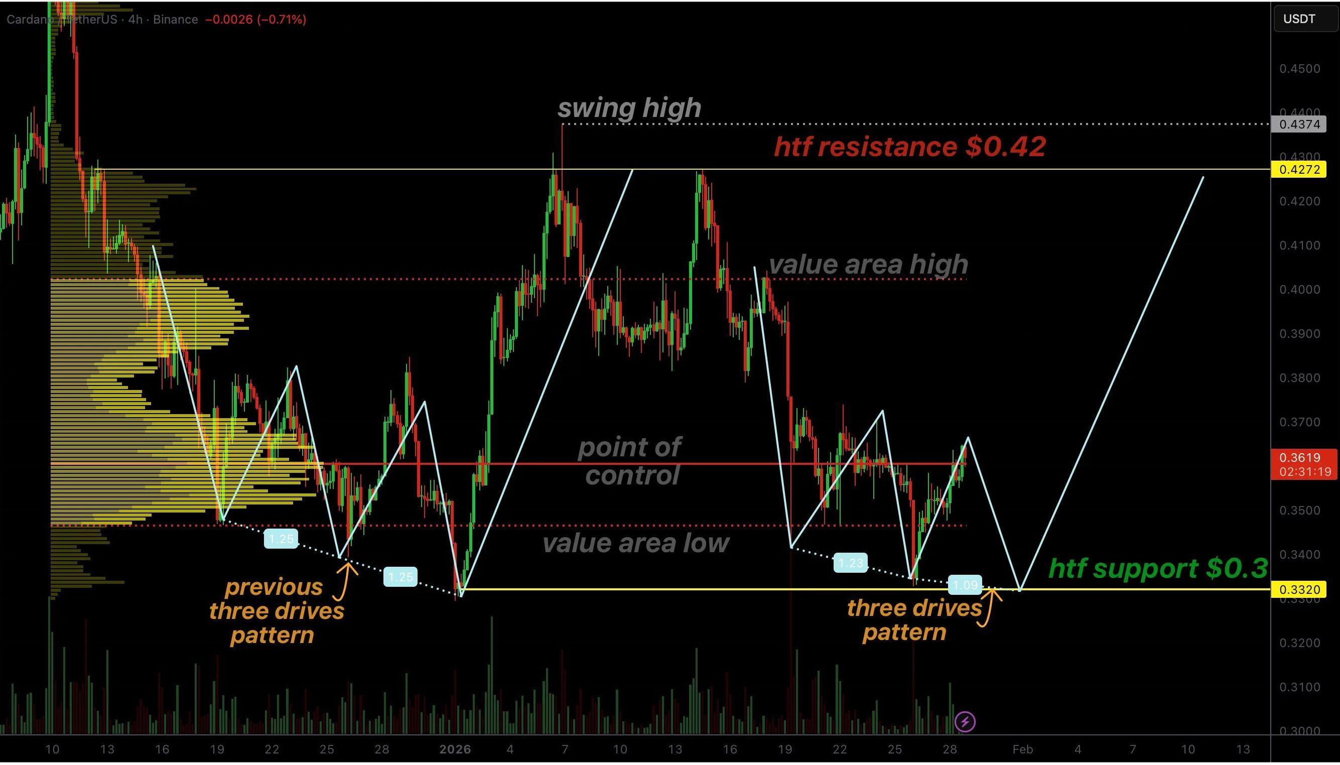 Der Preis akkumuliert derzeit um den Punkt der Kontrolle. Wenn der Preis hier leicht abgelehnt wird und $0.33 noch einmal getestet wird, ist das immer noch in Ordnung, solange es danach genügend Kaufkraft gibt, um nach oben zu drücken. Dieses Setup lebt nur, wenn die Marke von $0.33 gehalten wird. Wenn diese Marke durchbrochen wird, dann weg mit dem Chart, das Modell ist gescheitert und der Preis wird nach einem tieferen Boden suchen.