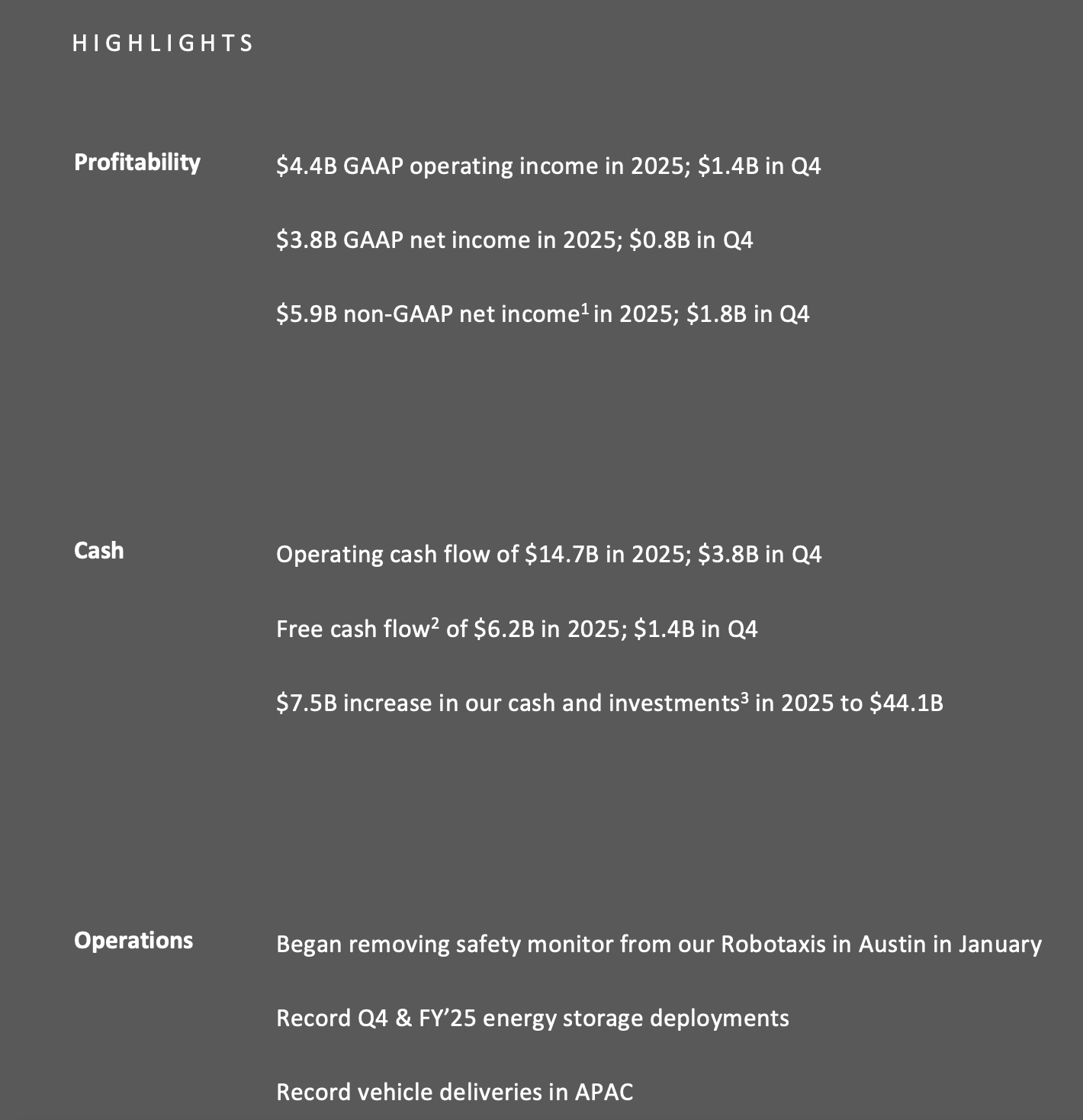 Tesla geht mit einem massiven "Kriegskassen" von fast 44,1 Milliarden Dollar in bar und Investitionen ins Jahr 2026. Trotz eines Rückgangs des Nettoeinkommens im vierten Quartal 2025 bleibt ihr Kerngeschäft äußerst profitabel und generiert starke Cashflows, die leicht die teuren Produktionssteigerungen für den Cybercab (Robotaxi), Semi und Optimus-Roboter, die für dieses Jahr prognostiziert sind, finanzieren können.