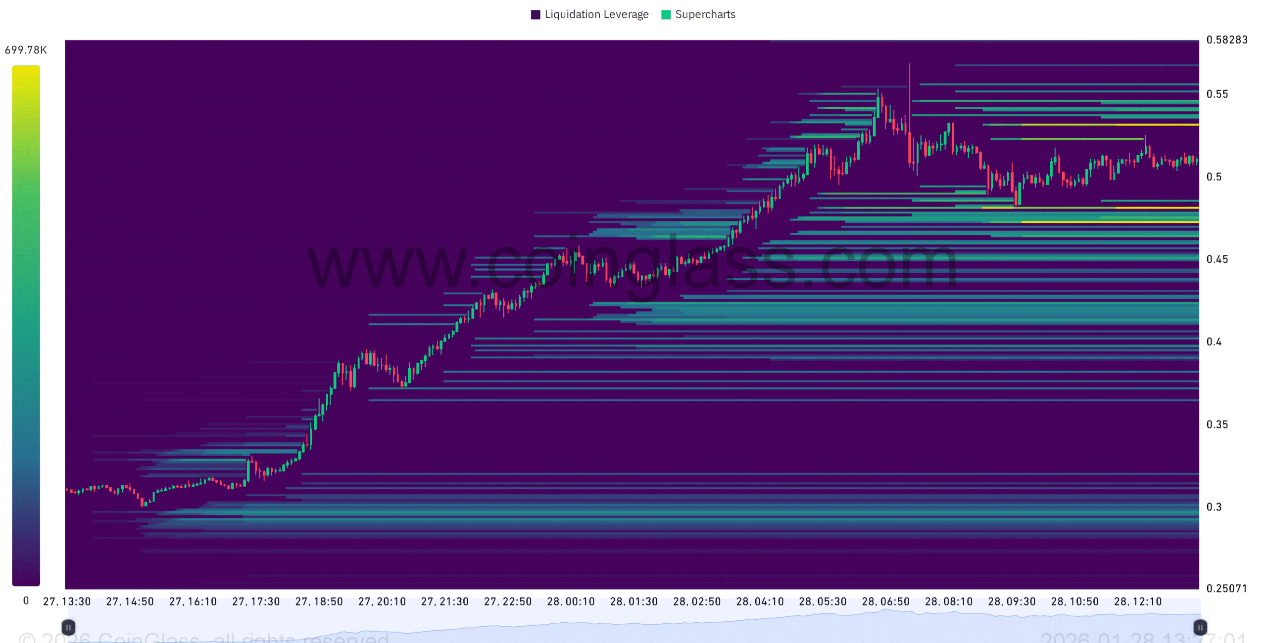 Ein großer Liquiditätsblock befindet sich hier. Wenn der Preis auf $0,47 fällt, wird dies eine Kette von Long-Liquidationen auslösen und die Aufwärtsstruktur außer Kraft setzen.