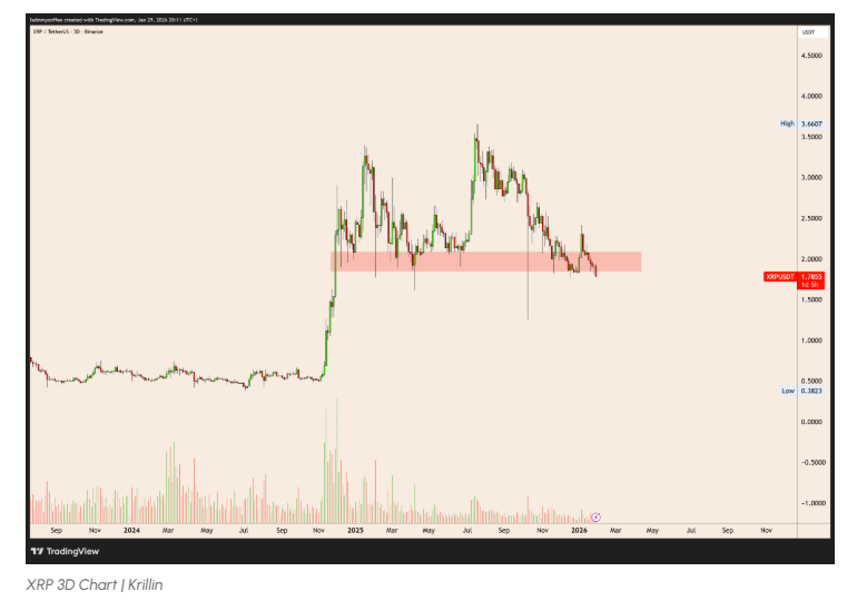 Marktanalyst Krillin hat letzten Monat erstmals auf diesen langjährigen Unterstützungsbereich hingewiesen. Während XRP diesen Bereich trotz des Rückgangs im vierten Quartal 2025 hielt, lobte er die Widerstandsfähigkeit des Vermögenswerts und betonte, dass XRP die Unterstützung über ein Jahr lang aufrechterhalten hatte.