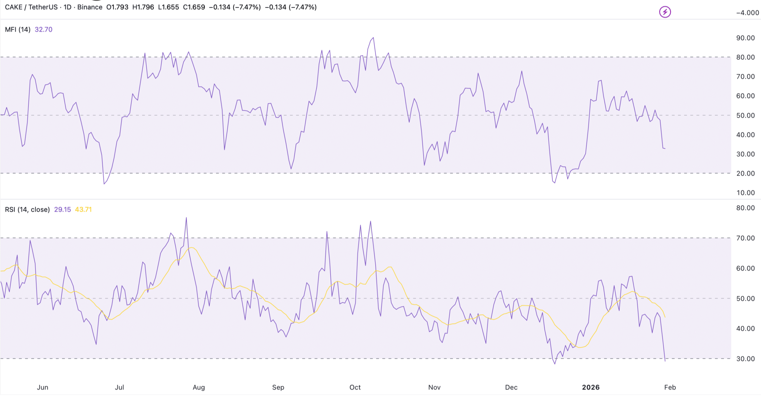 Der MFI-Indikator bestätigt, dass das Kapital weiterhin abfließt und sich tief im Bearish-Bereich befindet.
