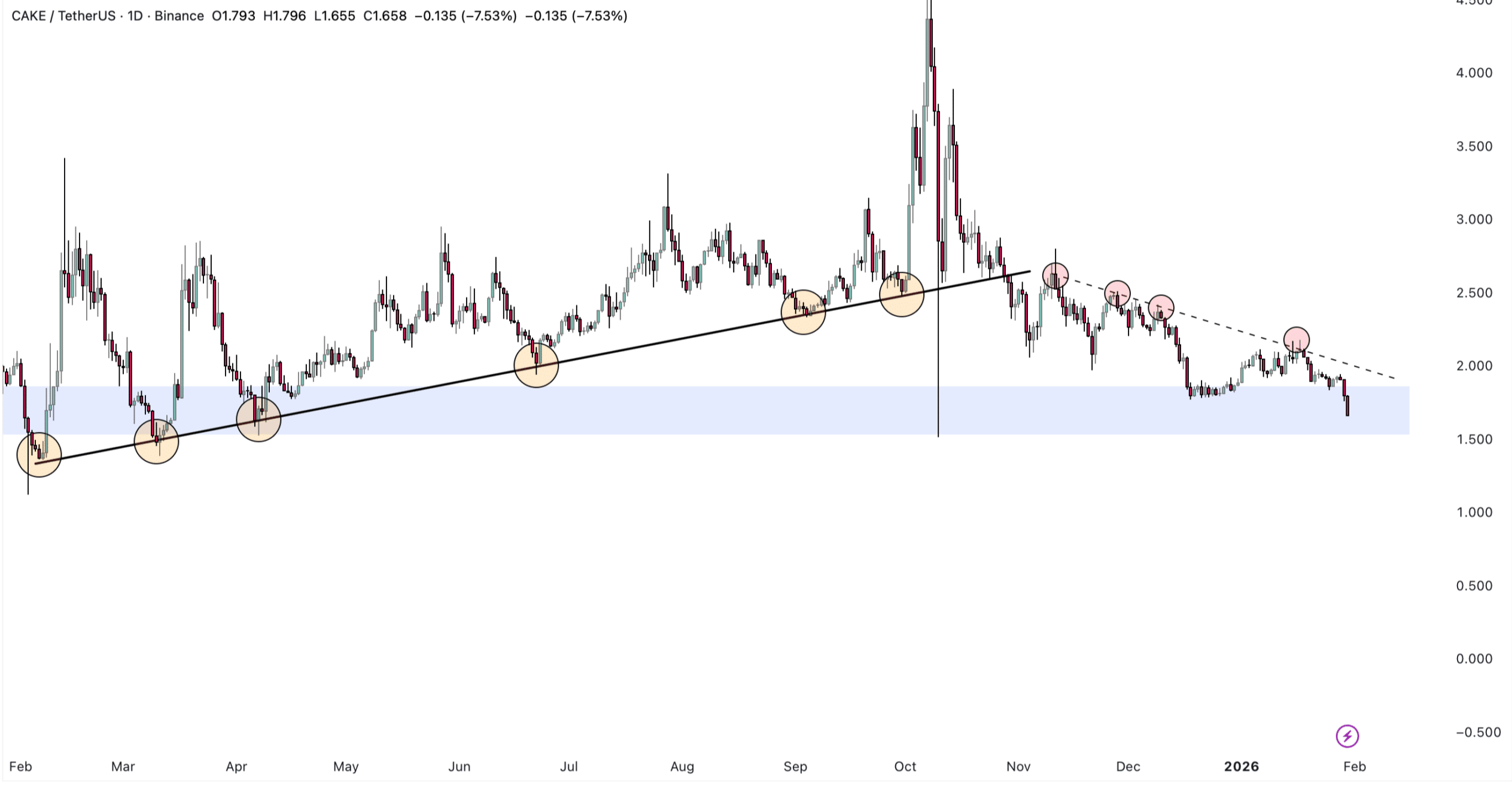CAKE ist in den historischen Unterstützungsbereich eingetreten, der zuvor große Preisanstiege ausgelöst hat.