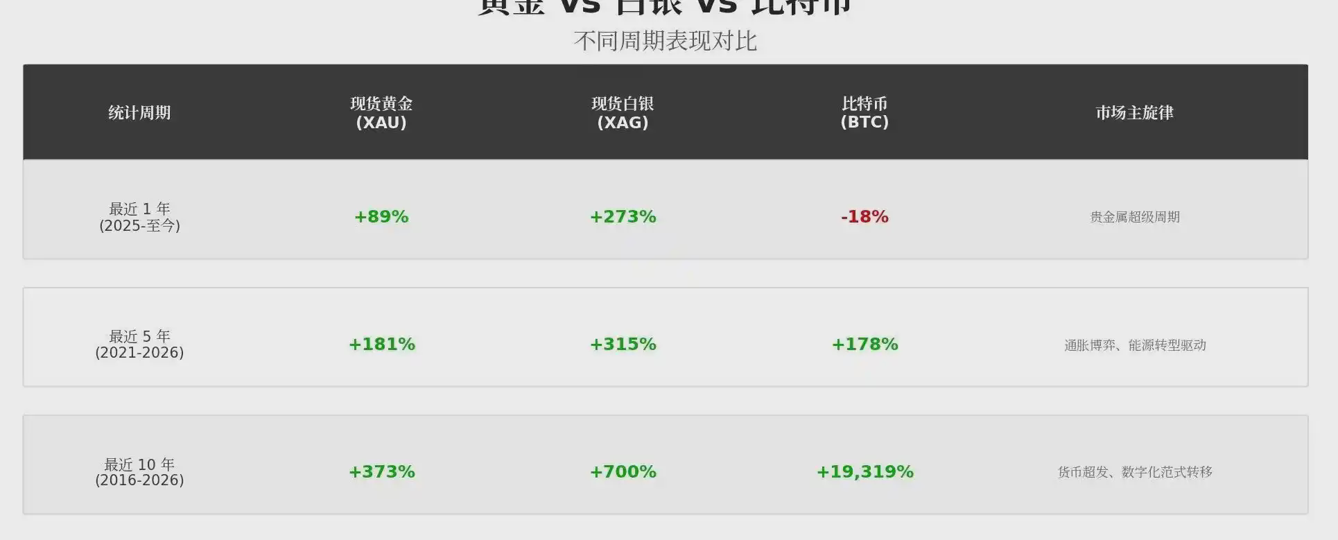 1. Das Spiel über Zyklen hinweg: Der zehnjährige Wettstreit zwischen Gold, Silber und Bitcoin