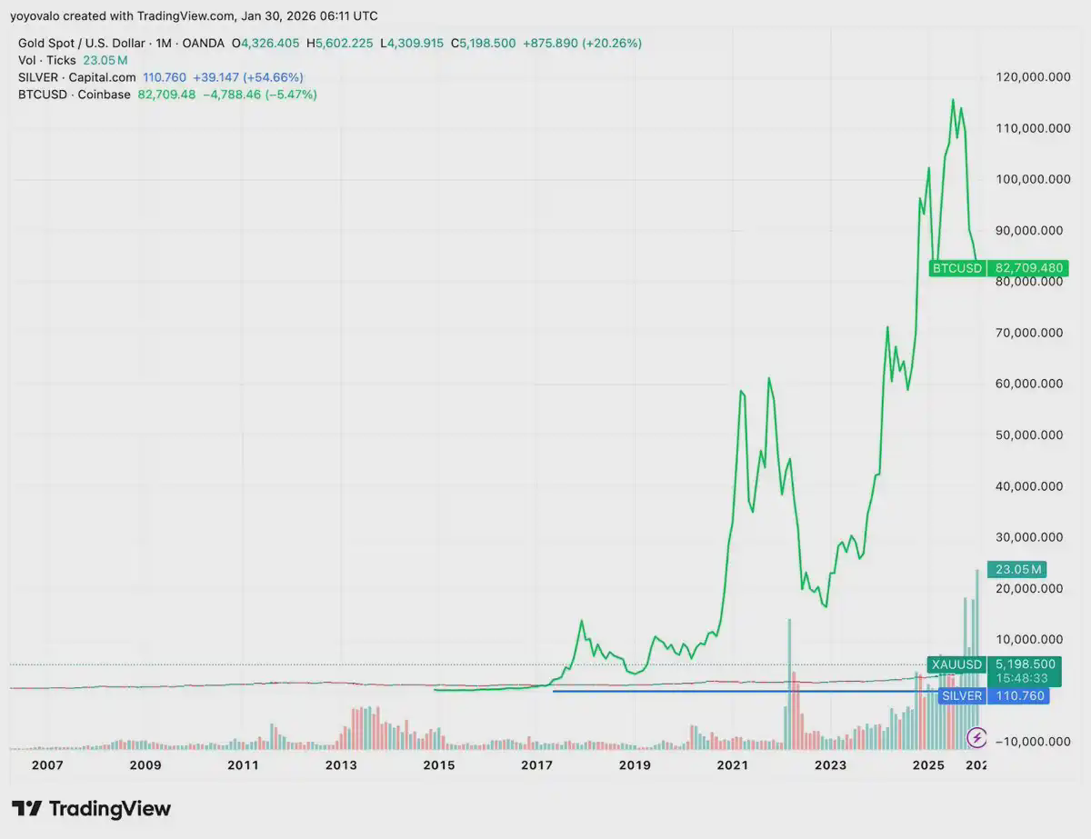 Wenn man aus einer langfristigen Perspektive schaut, bleibt Bitcoin eines der ertragreichsten Vermögenswerte. Aber im letzten Jahr hat Bitcoin deutlich hinter Gold und Silber zurückgeblieben. Die Marktbewegungen von Anfang 2025 bis Anfang 2026 zeigen ein extrem ausgeprägtes binäres Differenzierungsmerkmal, der Edelmetallmarkt ist in eine Phase eingetreten, die als „Superzyklus“ bezeichnet wird, während Bitcoin etwas schwach wirkt. Hier sind drei Schlüsselvergleiche der Zyklen: