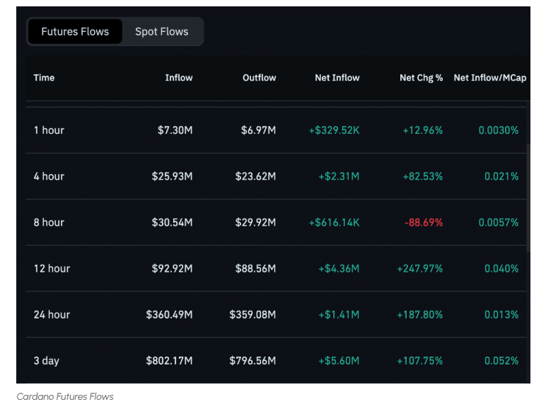 In den letzten 24 Stunden hat Cardano eine solide Marktteilnahme erlebt, mit einem Nettostrom von $360.49M in Futures. Dies spiegelt eine positive Änderung von $1.41M wider, was einer beeindruckenden Steigerung von 187.80% im Vergleich zu den vorherigen Zahlen entspricht.