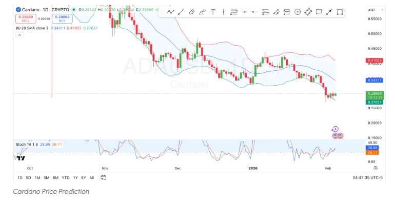 Der Stochastische Oszillator liegt derzeit bei 28.95, verbessert sich jedoch und signalisiert, dass ADA die überverkaufte Region geräumt hat, was Potenzial für höhere Preise suggeriert. Insgesamt wäre eine Bewegung über die 20-Tage-SMA bei $0.3431 erforderlich, um eine Trendwende zu bestätigen.