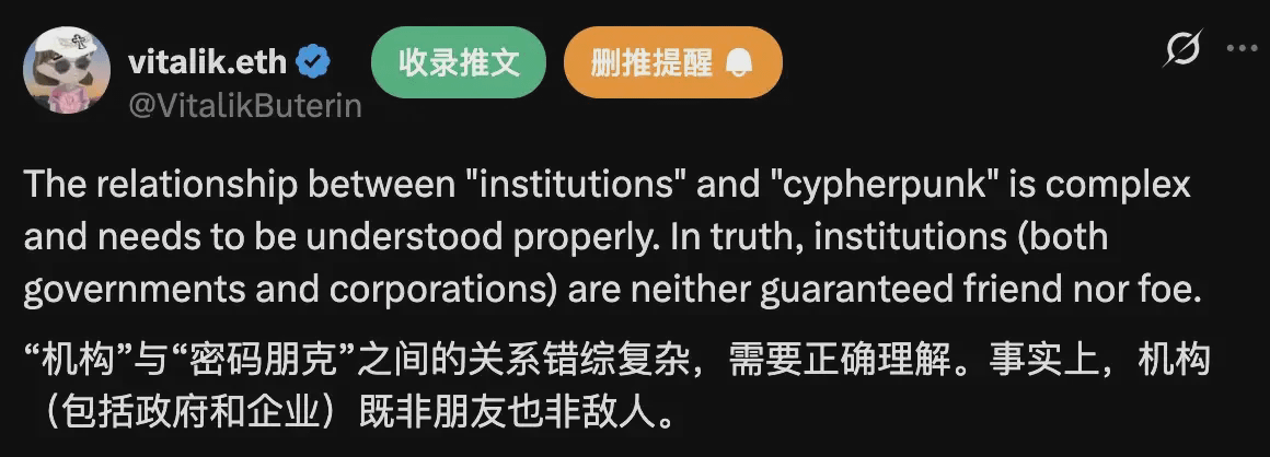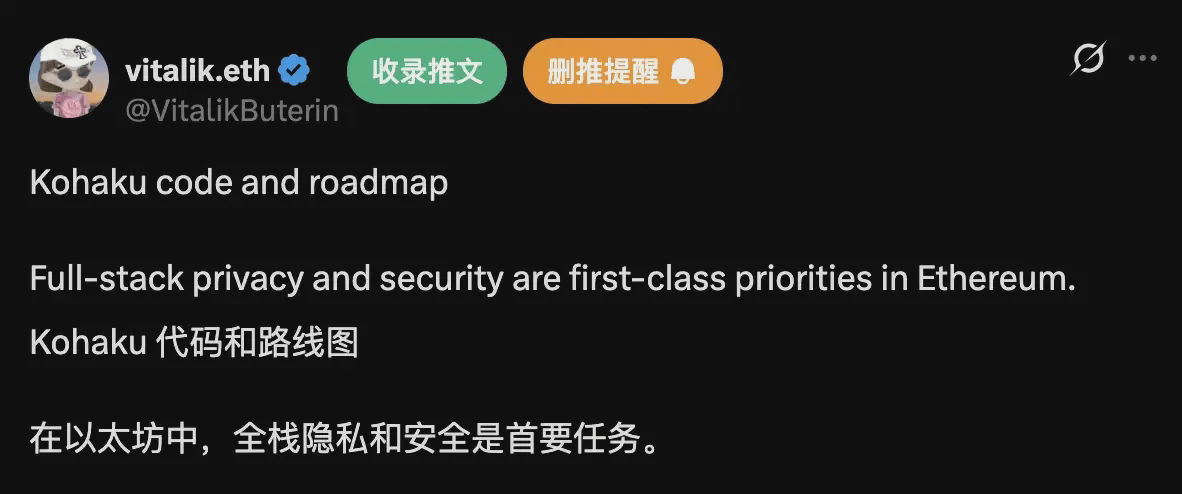 Im Oktober 2025 hob Vitalik die Privatsphäre zur "ersten Priorität" von Ethereum. Er gab zu, dass die anfängliche Vernachlässigung der Privatsphäre ein unvermeidlicher Schritt war, weil die Technologie damals nicht ausgereift war. Aber jetzt, mit der Reifung von nullwissenden Beweistechniken wie ZK-SNARKs, kann die Privatsphäre nicht länger aufgeschoben werden.