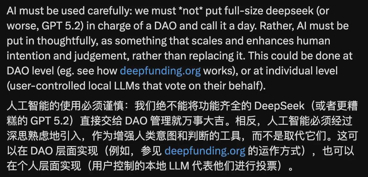 "KI muss vorsichtig eingesetzt werden: Wir dürfen niemals ein großes Sprachmodell die Kontrolle über ein DAO übernehmen lassen... Im Gegenteil, KI muss in ein größeres, von Menschen geführtes System integriert werden und als Bestandteil darin wirken."