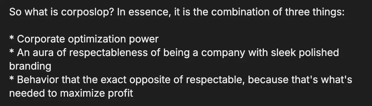 Der von Vitalik geschaffene Begriff "corposlop" kann so interpretiert werden: Unternehmensmüll, der eine glänzende Fassade hat. Unternehmen und Produkte mit starken kommerziellen Fähigkeiten und ausgefeiltem Branding, die jedoch für Profit unethisches Verhalten an den Tag legen.