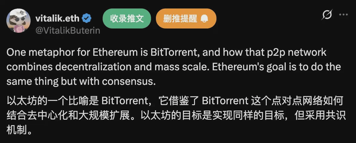 Im Jahr 2025 betonte Vitalik wiederholt, dass sich die zugrunde liegende Erzählung von Ethereum ändern muss. Es ist nicht mehr der "Weltcomputer", der versucht, alles auszuführen, sondern es sollte eine "Internet-ähnliche öffentliche Infrastruktur" wie Linux oder BitTorrent werden, oder anders gesagt, "TCP/IP für Finanzen".