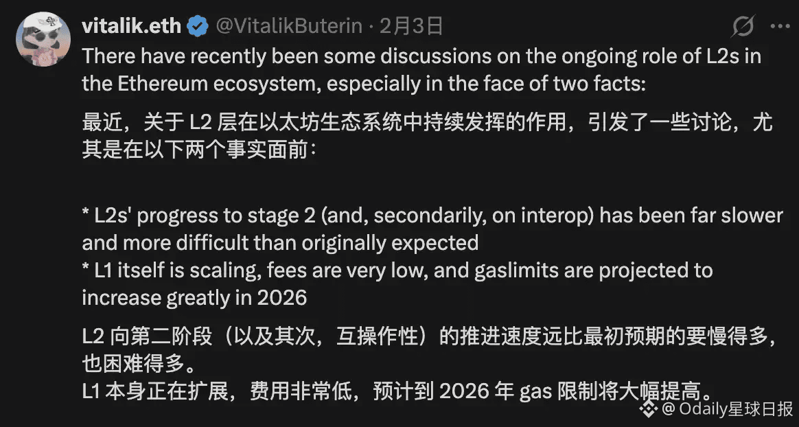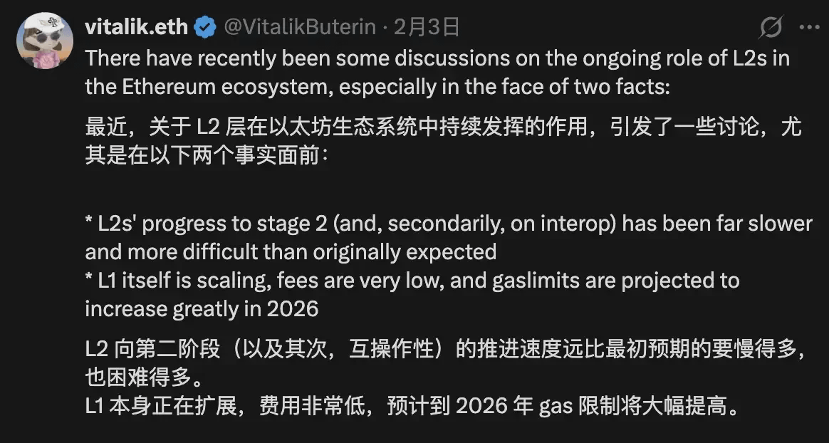 Am 3. Februar 2026 veröffentlichte Vitalik auf X einen langen Artikel, in dem er die L2-Strategie von Ethereum erheblich korrigierte.