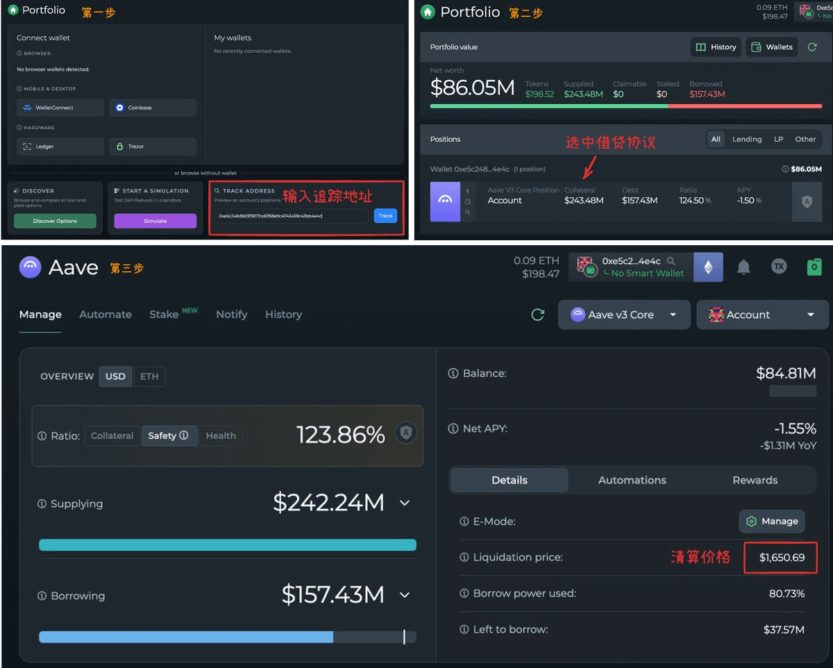 DeFi Saver unterstützt derzeit keine Aggregation mehrerer Wallets. Wenn Sie die Kreditpositionen der sechs Adressen von Yi Boss sehen möchten, müssen Sie sie einzeln eingeben. Der neueste Liquidationsbereich liegt bei [$1,575.13 - $1,681.97] (momentan habe ich kein besseres Tool gefunden, wenn Sie eines haben, hinterlassen Sie bitte einen Kommentar~)
