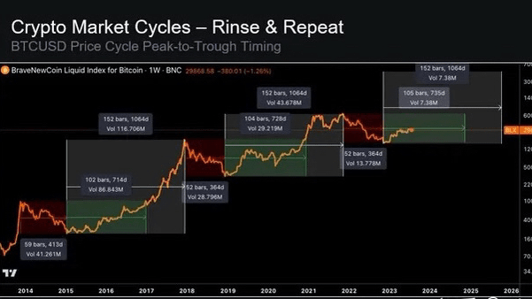 Die vergangenen Marktzyklen für Kryptowährungen folgten diesem Muster.