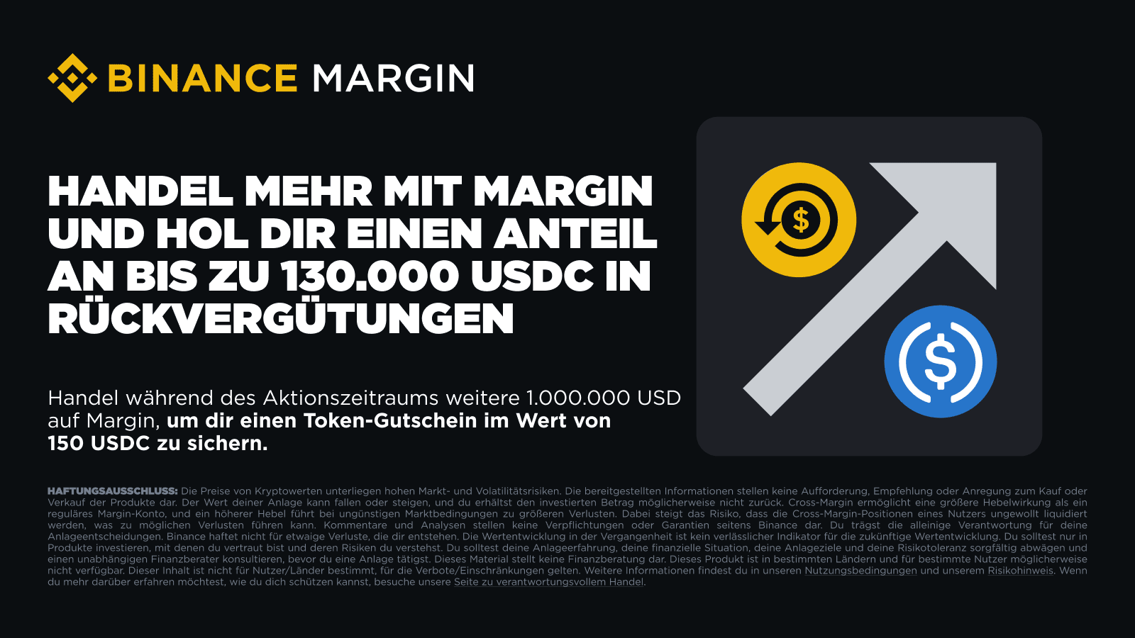 Die Preise von Kryptowerten unterliegen hohen Marktrisiken und Preisschwankungen. Die bereitgestellten Informationen stellen keine Aufforderung, Empfehlung oder Anregung zum Kauf oder Verkauf der Produkte dar. Der Wert deiner Anlage kann fallen oder steigen, und du erhältst den investierten Betrag möglicherweise nicht zurück. Cross-Margin trägt zu einer größeren Hebelwirkung bei als ein reguläres Margin-Konto, und ein höherer Hebel führt bei ungünstigen Marktbedingungen zu größeren Verlusten. Dabei steigt das Risiko, dass die Cross-Margin-Positionen eines Nutzers ungewollt liquidiert werden, was zu möglichen Verlusten führen kann. Kommentare und Analysen stellen keine Verpflichtungen oder Garantien seitens Binance dar. Du trägst die alleinige Verantwortung für deine Anlageentscheidungen. Binance haftet nicht für etwaige Verluste, die dir entstehen. Die Wertentwicklung in der Vergangenheit ist kein zuverlässiger Indikator für die zukünftige Wertentwicklung. Du solltest nur in Produkte investieren, mit denen du vertraut bist und deren Risiken du verstehst. Du solltest deine Anlageerfahrung, deine finanzielle Situation, deine Anlageziele und deine Risikotoleranz genau berücksichtigen und einen unabhängigen Finanzberater konsultieren, bevor du eine Anlage tätigst. Dieses Material ist nicht als Finanzberatung auszulegen. Dieses Produkt ist in bestimmten Ländern möglicherweise nicht verfügbar. Dieser Inhalt ist nicht für Nutzer/Länder bestimmt, für die Verbote/Einschränkungen gelten. Weitere Informationen findest du in unseren Nutzungsbedingungen und unserem Risikohinweis. Weitere Informationen dazu, wie du dich schützen kannst, findest du auf unserer Seite zu verantwortungsvollem Traden.