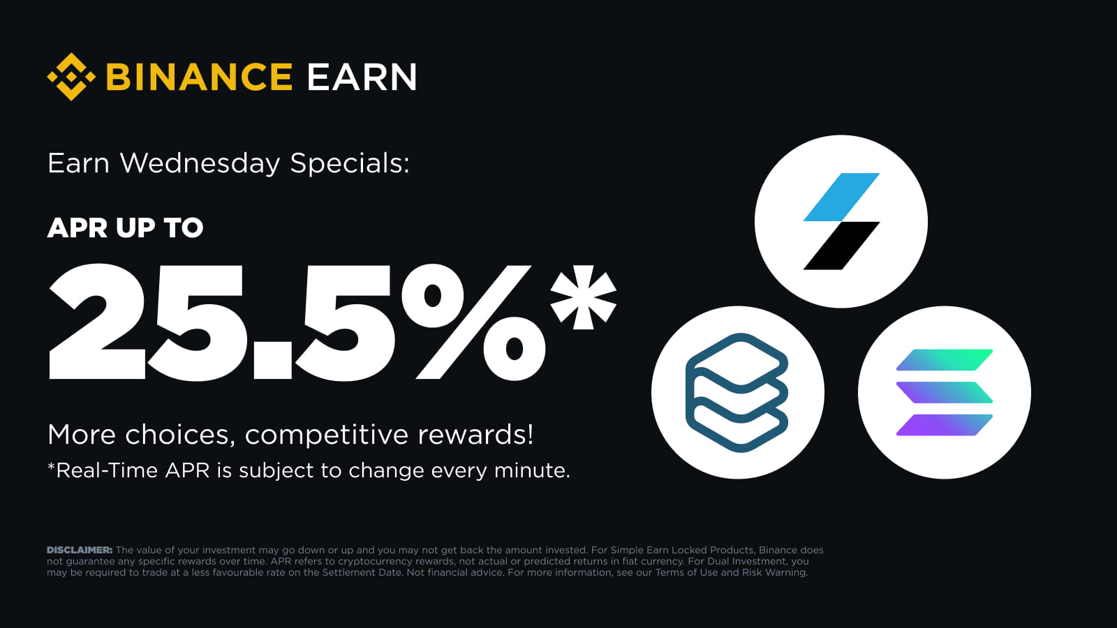 Binance Earn hält jeden Mittwoch neue Angebote für dich bereit. Sei gespannt auf den Earn Wednesday, um Belohnungen für Simple Earn, ETH-Staking, SOL-Staking, Dual Investment und weitere Produkte zu erhalten.