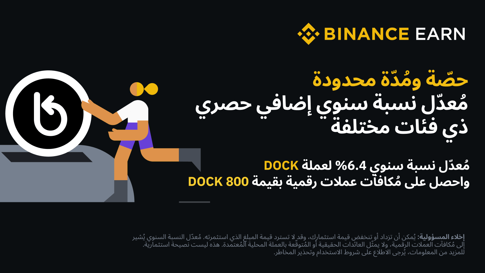 تقوم منصّة Binance Simple Earn بإطلاق عرضين جديدين لرموز DOCK على مُنتجات Simple Earn المرنة! أكمِل عمليات الاكتتاب على رموز DOCK على مُنتجات Simple Earn المرنة خلال فترة العرض للتمتّع بمُعدّل نسبة سنوي إضافي ذي فئات بقيمة 6.4% علاوةً على مُعدّل النسبة السنوي اللحظي و المُكافآت الحصرية
