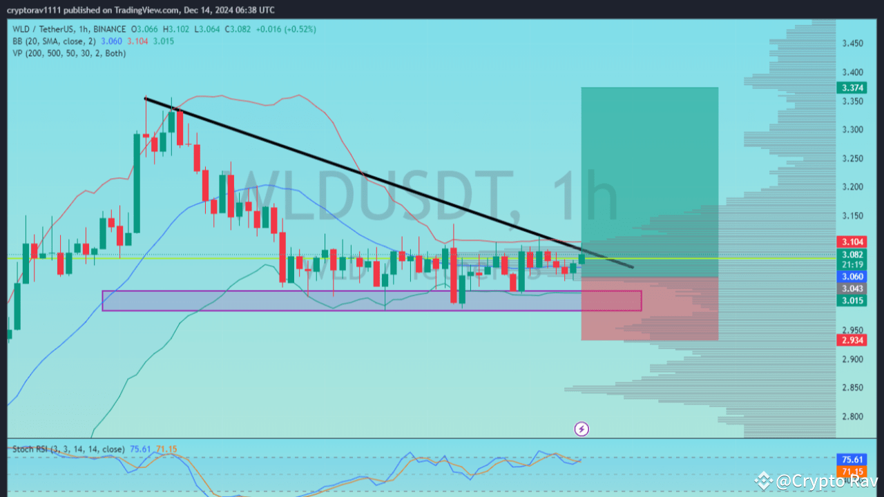 The WLD/USDT chart on the 1-hour timeframe shows a breakout setup with a descending trendline resistance. Stochastic RSI is entering overbought levels, suggesting bullish momentum. Bollinger Bands show price compression, indicating potential volatility. Volume Profile highlights support around $3.04, while the RSI Divergence Indicator confirms bullish bias.