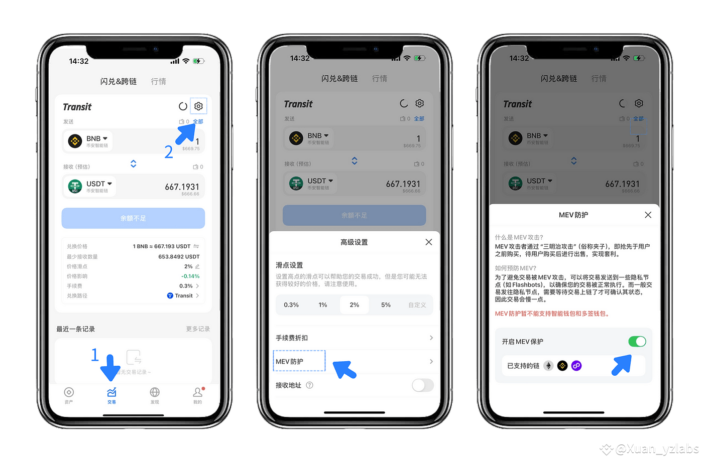 数据显示,超过50%的区块链用户都曾遭遇过MEV攻击却浑然不知,未开启防护的用户平均损失达$127。 在TokenPocket钱包中开启MEV防护非常简单,只需几步设置,即可为你的交易提供全方位保护,让你远离那些恶意的MEV攻击。