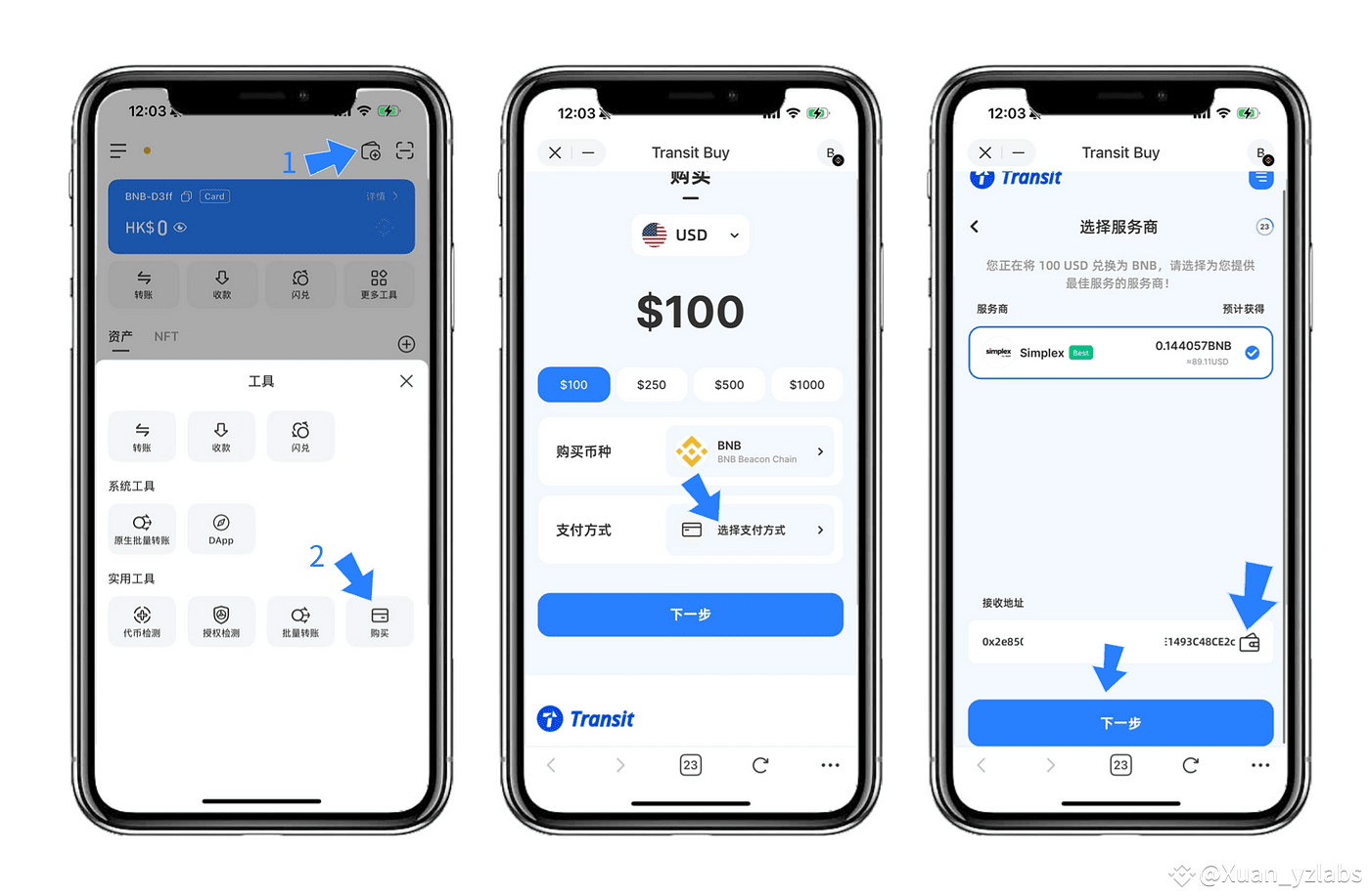 TokenPocket 内置了 Transit Buy 功能,为用户提供便捷的法币购买加密货币服务。本教程以 购买 BNB (币安智能链) 为例: