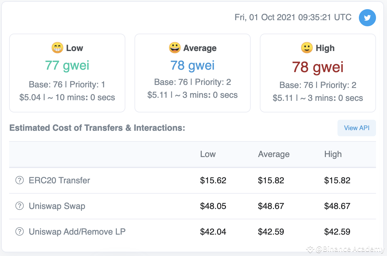 燃料费价格是以太坊交易费用的一部分。这些费用由交易所在的区块决定。每个区块都有各自的固定费用,根据网络流量而有所不同。Etherscan中的燃料费跟踪页面显示不同燃料费价格的金额和时间变化。这是一款非常实用的工具,可大致预测网络拥堵程度,以及简单转账或复杂智能合约交互需支付的费用。