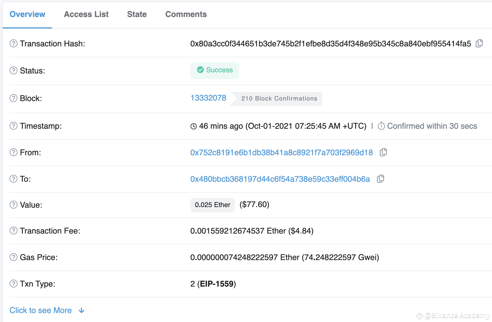 交易的区块编号。还可以看到已确认交易的次数。此处显示交易区块后添加到链中的区块数。