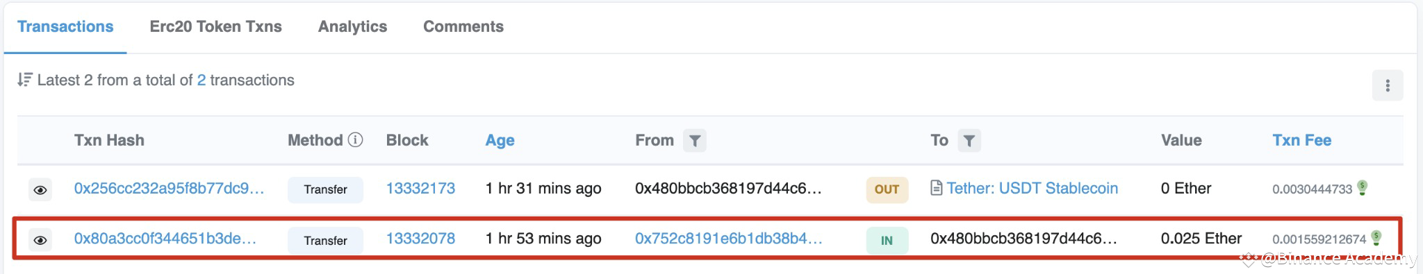 追踪交易是Etherscan的一项基本功能。了解如何追踪加密货币的动向,是解锁区块链其他一切信息的关键。例如,假设0.025枚以太币(ETH)从钱包发送到了以下公共地址:0x480bbcb368197d44c6f54a738e59c33eff004b6a。
