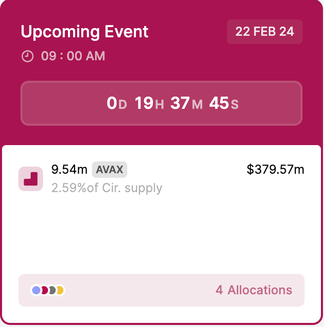 Theo dữ liệu từ Token.Unlocks, hiệu suất kém xảy ra khi khoảng 9,54 triệu token AVAX bị khóa trước đó, trị giá hơn 379 triệu USD, sẽ được mở khoá vào thứ Năm, làm tăng nguồn cung lưu hành của tài sản lên khoảng 2,59%.