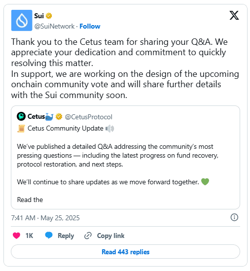 In a statement, Cetus hopes for a successful community vote to unlock the $162 million that has been frozen. Sui stated that they are designing the on-chain vote, which is likely to take place this week.
