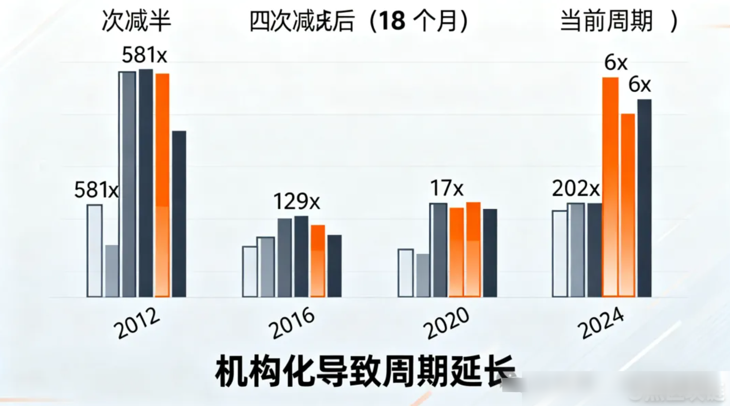 Data shows that the previous three cycles exhibited the pattern of 'peaking 12-18 months after halving': the peak was reached 13 months after the halving in 2012, 17 months after the halving in 2016, and 18 months after the halving in 2020.