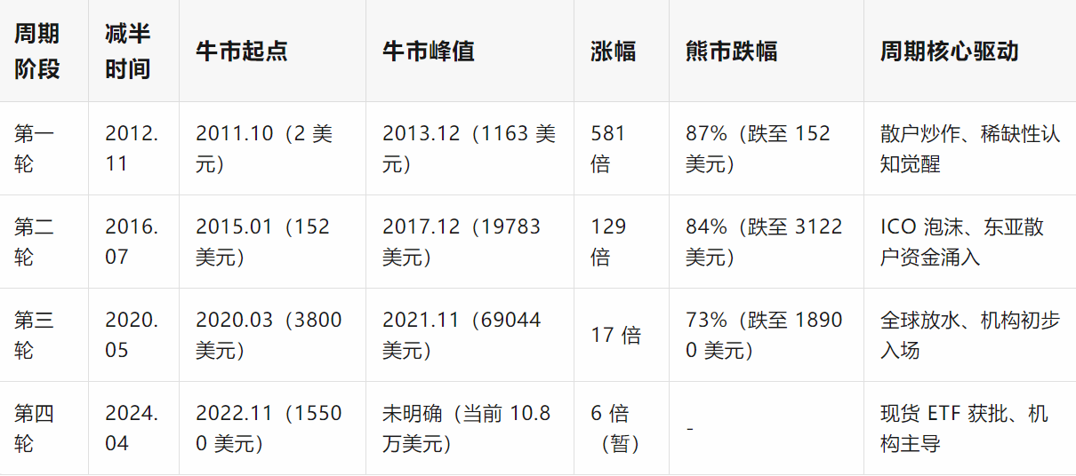 Since its inception in 2009, Bitcoin has formed a strong binding 4-year cycle closely related to the 'halving event'—the mining rewards are halved every four years (block rewards decrease from 50BTC to 25BTC, 12.5BTC, 6.25BTC, and after the fourth halving in 2024, it will be 3.125BTC), causing prices to soar due to supply contraction, followed by a deep bear market, creating a complete cycle.
