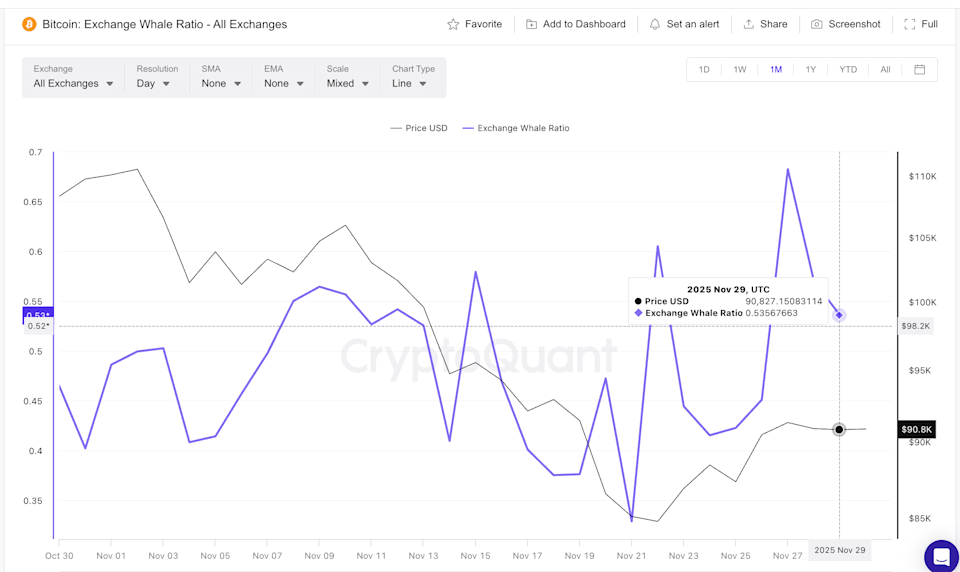 The Exchange Whale Ratio increased from 0.32 to 0.68 during November, and although it retraced to 0.53, it remains elevated. These levels reflect that a significant percentage of inflows to exchanges come from large wallets, which historically is associated with selling phases, not accumulation.