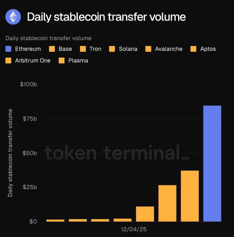 The chart shows that this figure far exceeds the total volume of Q3, pushing Ethereum ahead of traditional 'giants' like Visa and Mastercard in pure payment value.