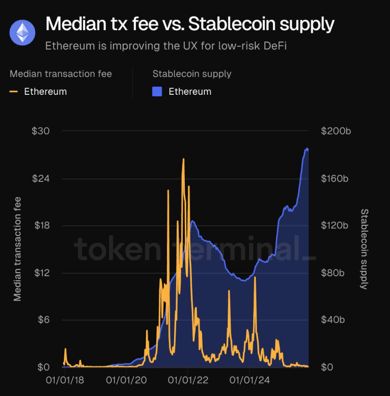 This upward momentum reflects a larger trend: average transaction fees on Ethereum have nearly dropped to zero, while the supply of Stablecoins on the network has exceeded 180 billion USD. The low-cost environment coupled with abundant liquidity has pushed the capital turnover rate on Ethereum to historical highs, particularly prominent in safe, low-risk DeFi sectors.
