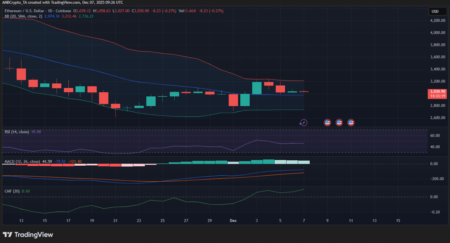 At the time of writing, ETH is maintaining stability, trading around the 3,030 USD mark, after a brief surge reaching 3,150 USD.
