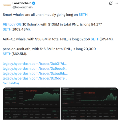 Ethereum is attracting significant bullish interest from whales, indicating strong market conviction. On the decentralized exchange platform Hyperliquid, several large companies are taking massive long positions in ETH worth hundreds of millions of dollars. Data from Lookonchain shows that BitcoinOG (1011short) holds long positions in ETH valued at $155.7 million after closing a $14 million position with a profit of $305,000. Other whales, such as Anti-CZ and pension-usdt.eth, maintain long positions in ETH worth $194 million and $62.5 million, respectively. Arkham Intelligence also revealed that a whale at address 0xBADBB used two accounts to open long positions in ETH totaling nearly $189.55 million, highlighting the growing bullish momentum.