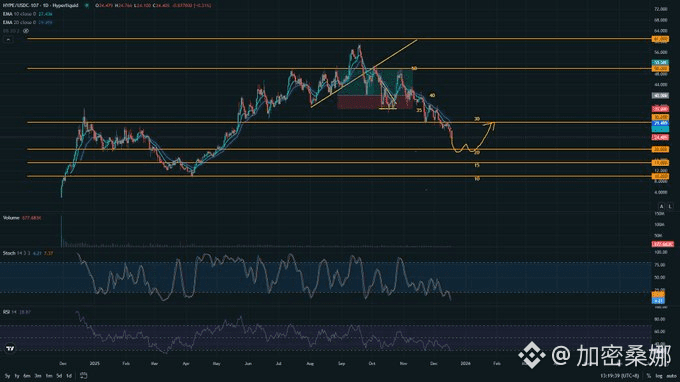 HYPE:直接宣布 “废了”!别抱幻想,盯着 20 美元支撑就行,跌到这位置再考虑进场,现在冲就是当接盘侠~