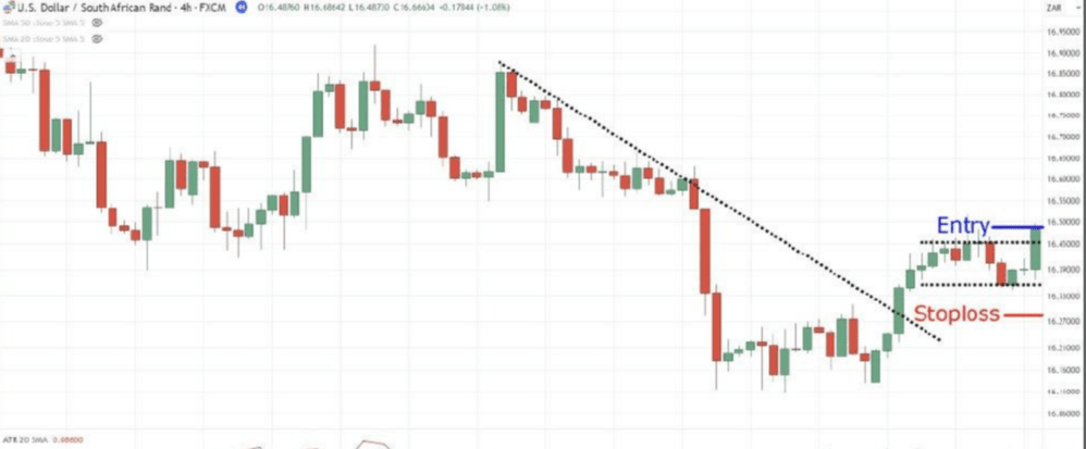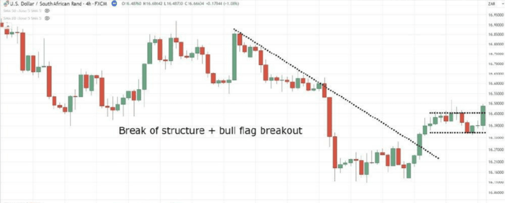 Some traders (maybe even you) might not be satisfied with this, so how do you address this issue? Drop down to a lower time frame, allowing you to ensure that you don't miss the pattern you've been waiting for. But you may want to know: What are we looking for here? Simply put, the breakout of structures and flag patterns, as shown in the figure below. Once you identify that ideal flag pattern breakout, as shown in the figure below.