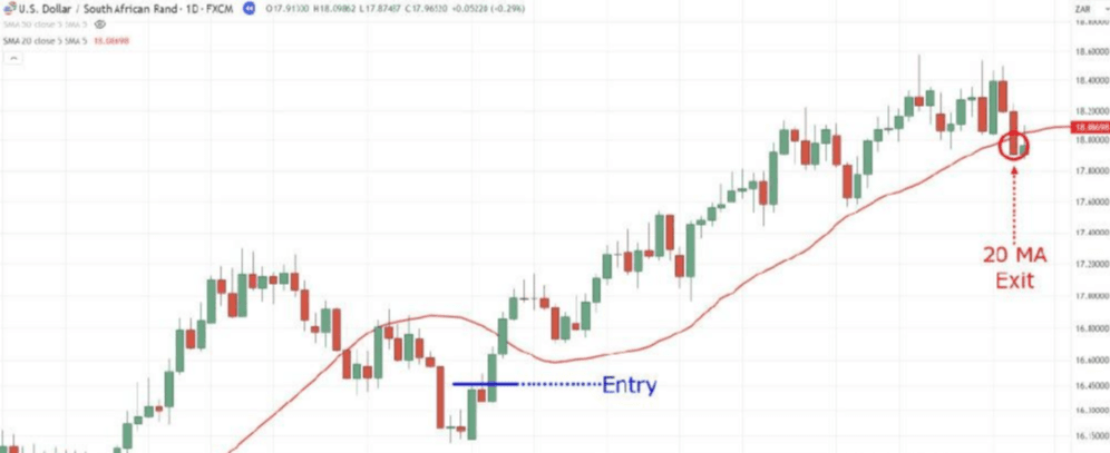 This is called transitional trading, where we enter using a shorter time frame and manage trades with a longer time frame. Think of this as tracking the safe details of your treasure. Let me explain how it works internally based on our example. Once you enter a structural breakout on the 4-hour time frame, you go back to the daily time frame and pull out the 20-period moving average; you will only exit the trade if the price closes (not touches) above the 20-period moving average, as shown in the figure below.