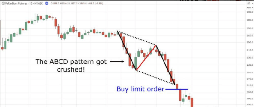 This is the most common mistake made by harmonic traders; just because the price forms an ABC pattern does not mean it will complete, and it never guarantees the completion of the C to B pattern. The market can easily reverse, as you observed in the previous example, as shown in the figure below.