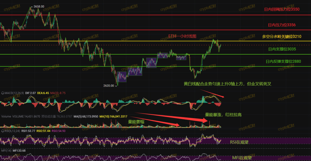 Today the core focus is on 3210! If it breaks through with volume and stabilizes, the next target will be 3356, which might even trigger a rebound. But if it stalls around 3210, there is a high probability of revisiting 3035, and if that can't hold, 2880 may also be tested. Tonight's volatility is sure to be significant, and bulls and bears will fiercely battle here!