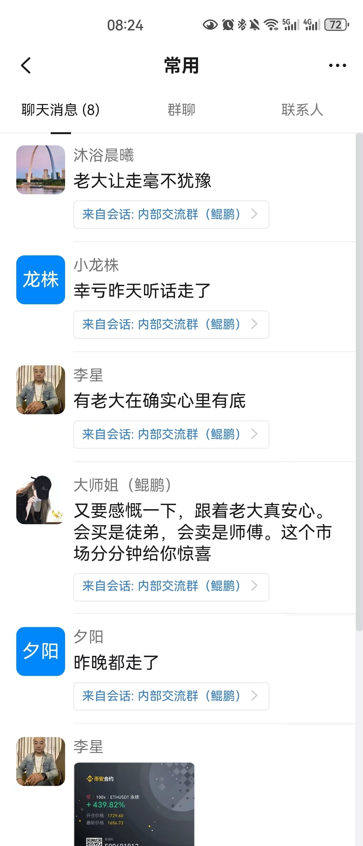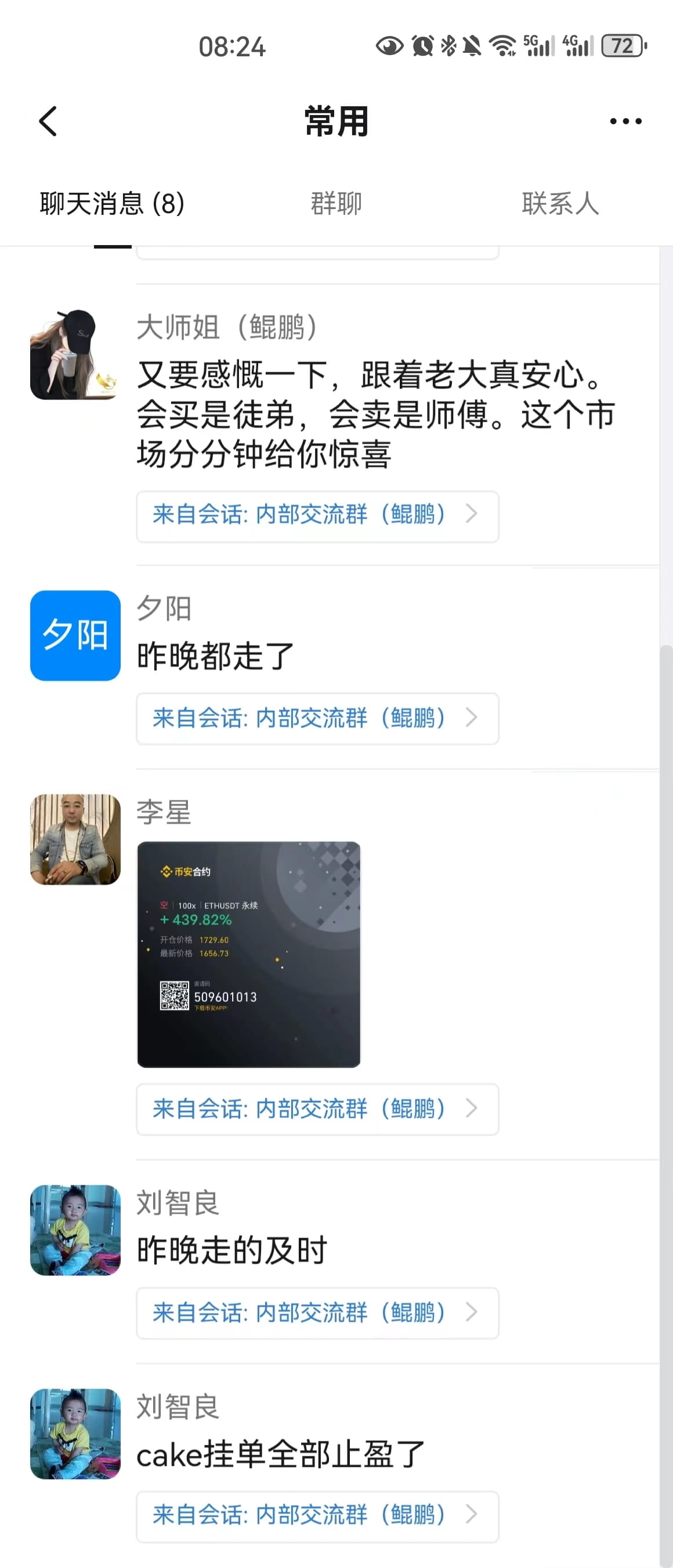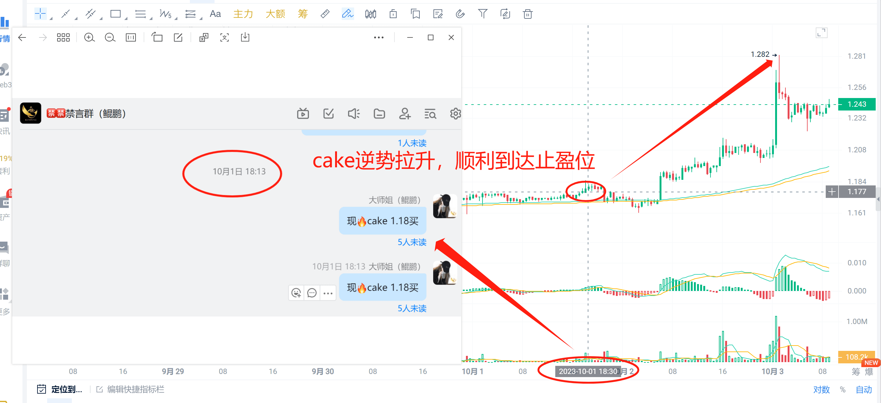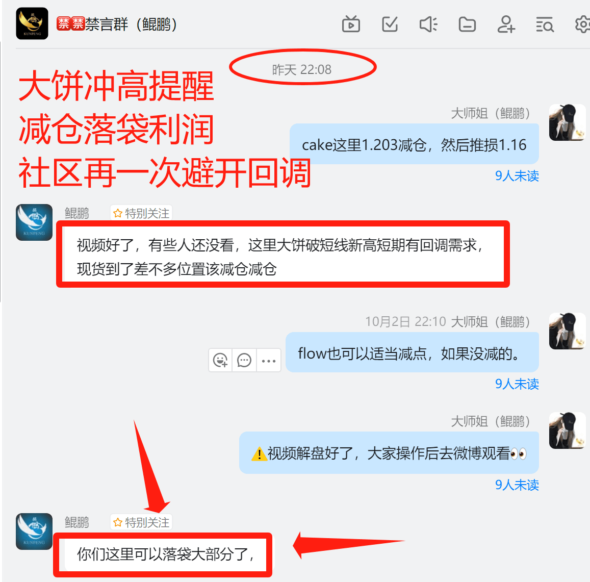 昨晚视频解盘明确告知大饼再次冲高会有回调预期,这个冲高可以减仓兑现短线利润。社区在昨晚22点最高点基本离场大部分利润,cake同时逆势拉伸顺利止盈。这不是预测,是循当下走势做出的预判。会买的师弟,会卖的师傅,会逃顶的是祖师爷。交易的本质是赚钱,不是充值信仰。如果你一直对这个市场存有主观思维,如果你们还是停留在哪个老师给你充值信仰和预测的准确度去做交易,最终这个市场分分钟会给你惊喜,你会发现你一顿操作下来,分文未赚,看看自己的钱包是不是这样呢?短暂的盈利绝对不是盈利,细水长流稳定复利才是交易的关键!