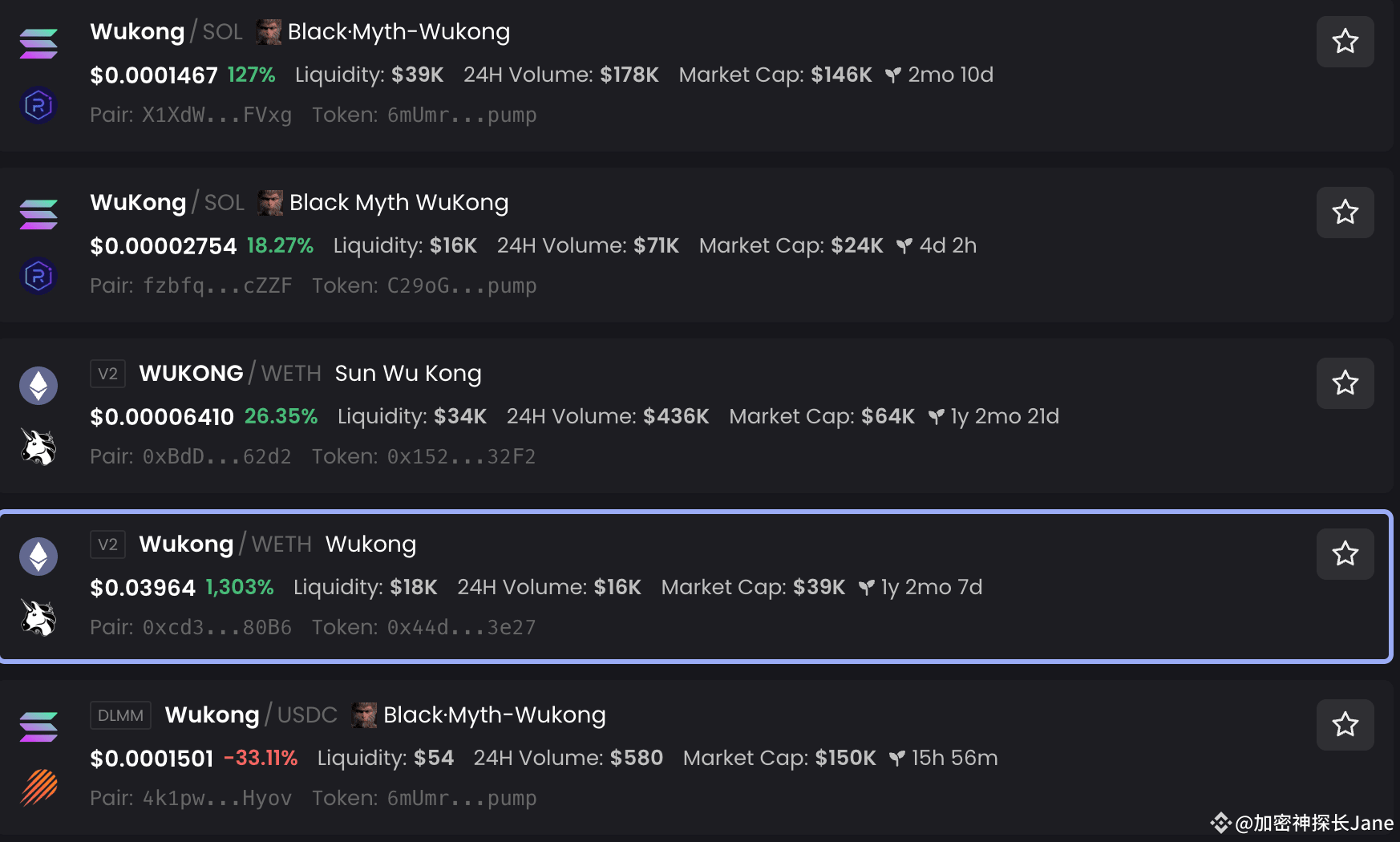 此外,也出现多个Wukong 同名代币,有的近24 小时暴涨1003%,但也有大跌33%。迷因币价格波动极大,投资风险极高,提醒切勿盲目跟风,应谨慎投资。
