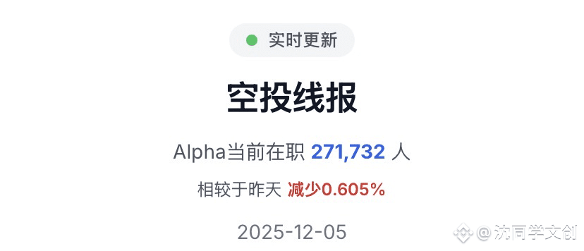 兄弟们,今早一看数据,昨天又离职了近2万人,总参与人数已经掉到27万左右。留下的可以说都是“铁杆粉丝”,在负重前行了。#ALPHA