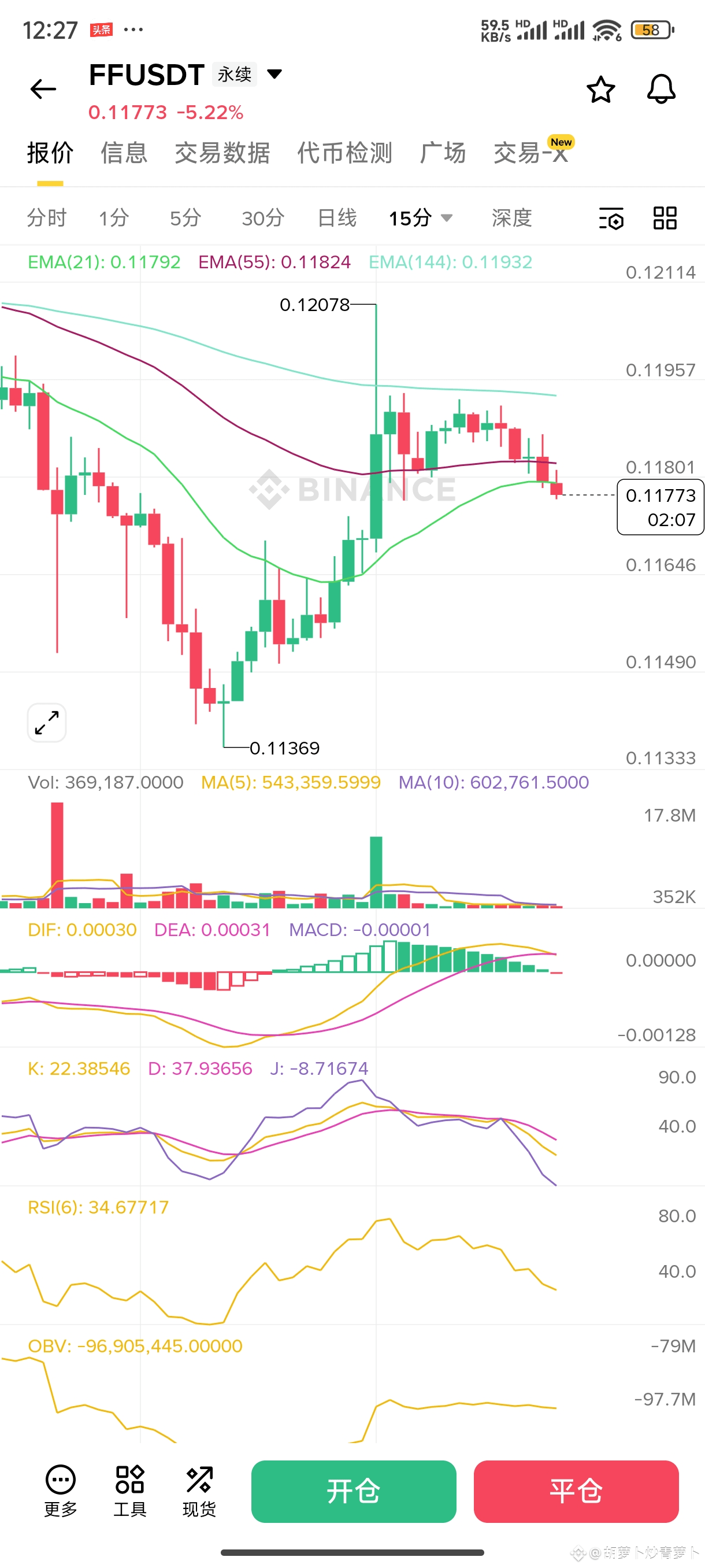 @Falcon Finance #FalconFinance 现在适合做空了,15分钟我们之前做多结束后,经历了短暂的盘整,前面第3根K线构成十字星,前后的K线都是阴线并且还是底部越来越低,构成了下降信号,同时MACD也构成了死叉,下跌的阻力看到0.11646附近,遇到反弹就止盈走人。