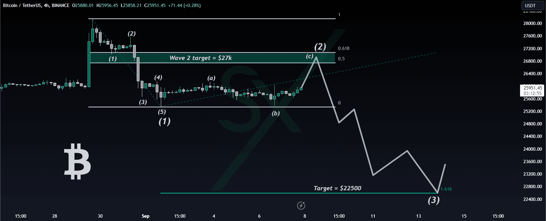 It looks like BTC now is in wave 2 of the wave 3 higher degree. Wave 1 inside wave 3 has the clear 5 waves structure and the current sideways looks like a corrective wave 2. This wave has the target at 0.61 Fibonacci level, approximately at $27k. Next move is gonna be too impulsive. 1.61 Fibonacci extension printed the $22500 as the next target, so it's gonna be the huge short.