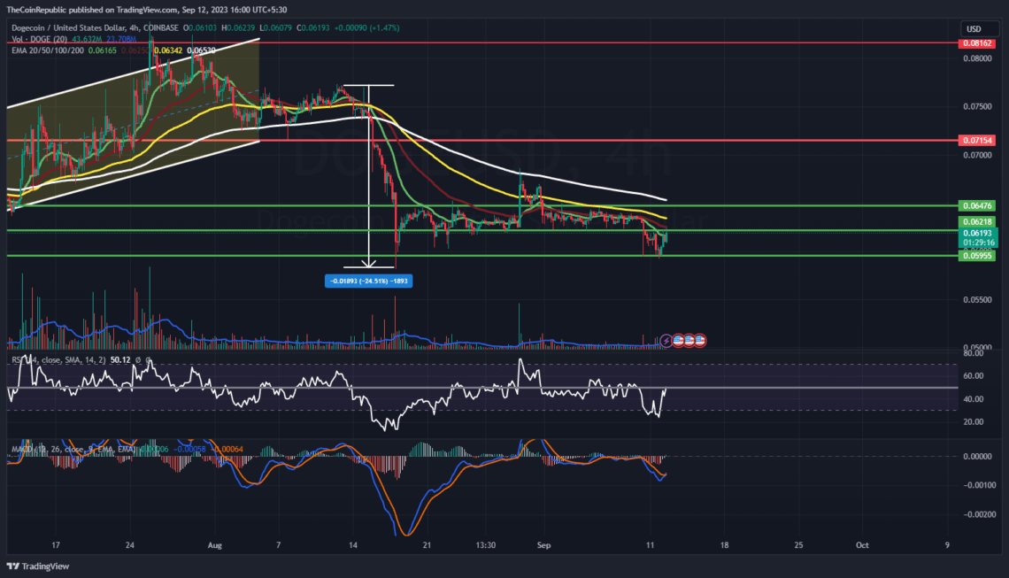 The Dogecoin price was at $0.06190 and gained 2.37% of the market value during the trading session of the day. The trading volume increased by 14.54% during the intraday trading session. This shows that buyers are trying to make savings to push the DOGE crypto upwards. The volume/market capitalization ratio was at 3.04%.