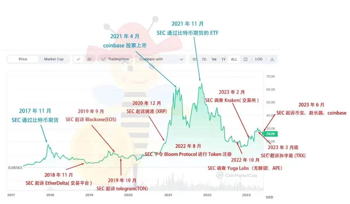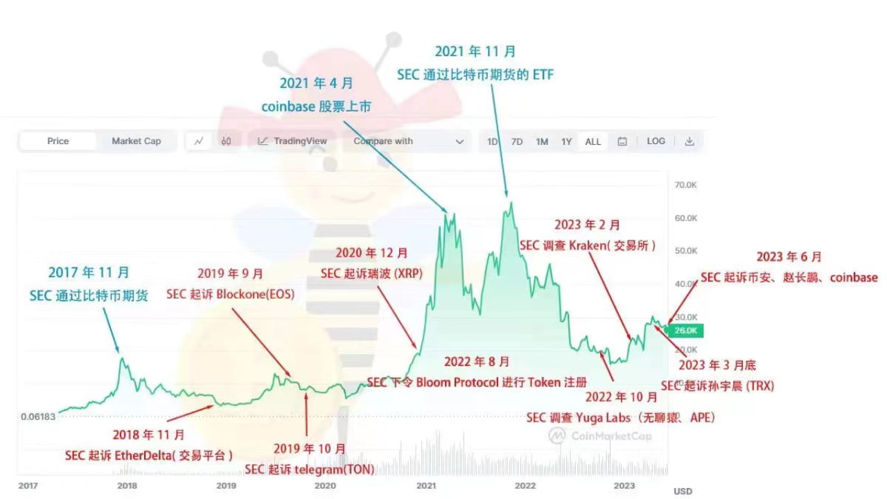 Back to the market, the market has been under pressure these two days due to the SEC's lawsuit against Binance and Coinbase. The short-term market may not improve much, but I want to say one thing, remember the price when FTX went bankrupt? For the B circle, the impact of bad news does suppress prices, but in the long run, it is an opportunity. Someone has marked the past actions of the SEC and the price trend of Bitcoin. It can be seen that the positive news on ZC is often at a high price. On the contrary, when the negative news on ZC is suppressed, it is an opportunity.