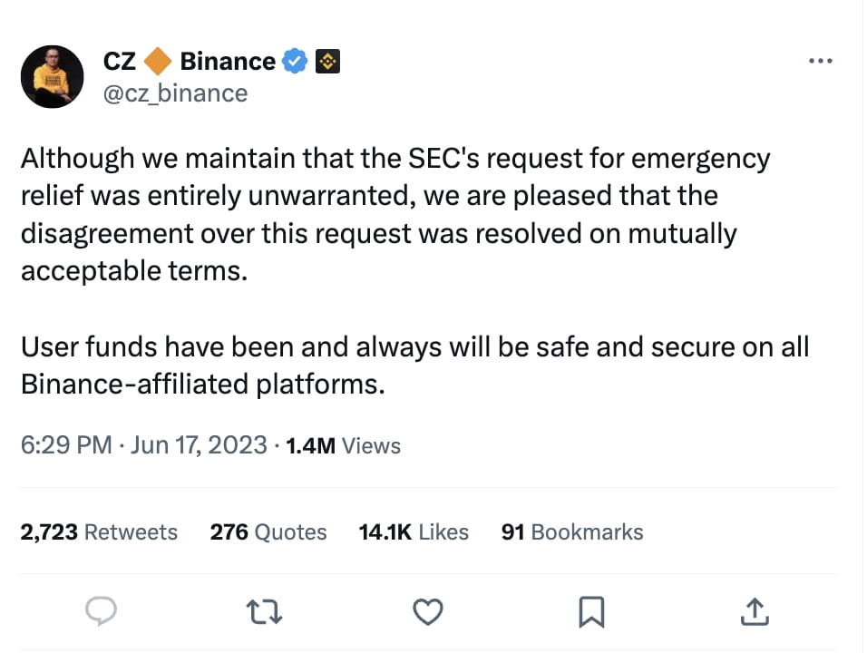 Nonetheless, as the regulatory uncertainty begins to fade, CZ can now find solace and concentrate on Binance's future. In a tweet, the veteran crypto entrepreneur emphasized that the SEC's emergency relief request was unnecessary, affirming that the mutually agreed-upon resolution would enable Binance to progress unhindered.