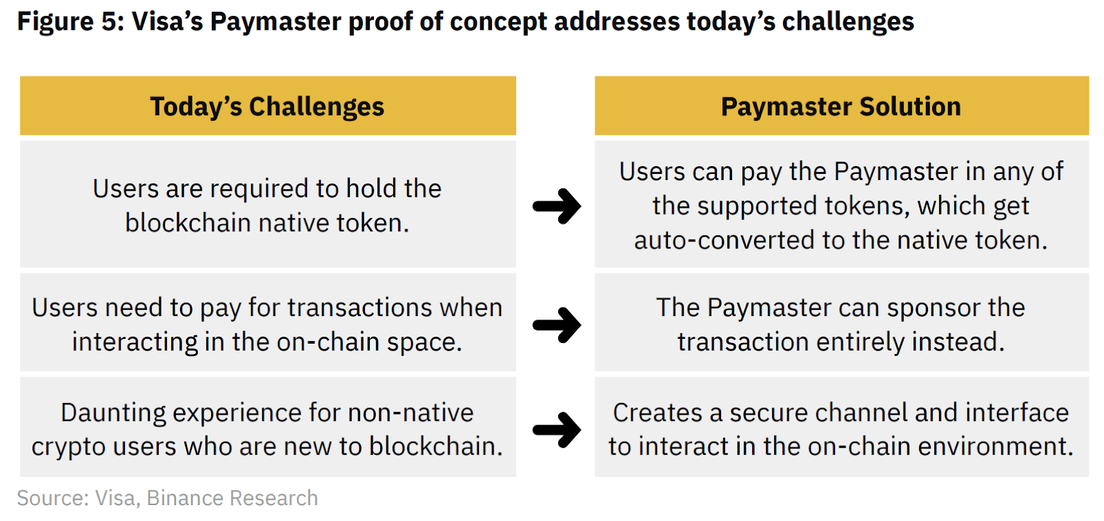 6) An area of focus was in the payments services through fee abstraction of the Paymaster component of ERC-4337 to enable ‘gasless transactions’ - users will not need to own the native token to pay for transactions. These experiments have been largely driven by Visa’s team.
