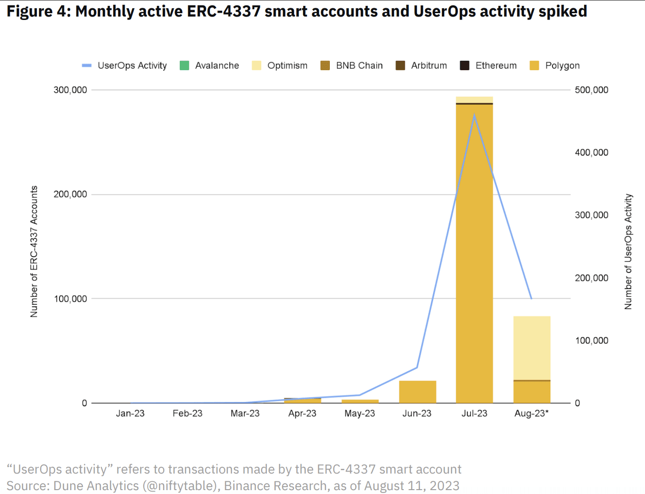5) The release of ERC-4337 standards enables smart accounts to replace EOAs with a more flexible programmable layer. Since its deployment on March 1, 2023, the adoption rate has skyrocketed, largely driven by @0xPolygonLabs.